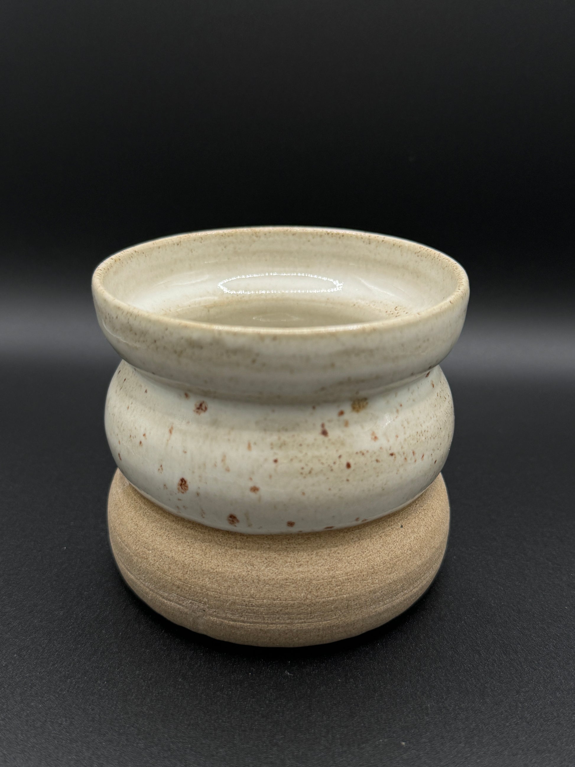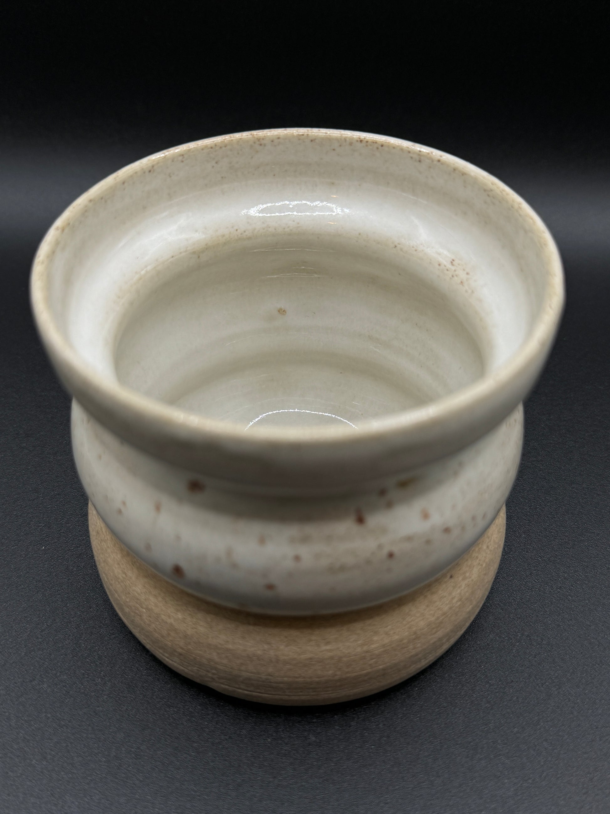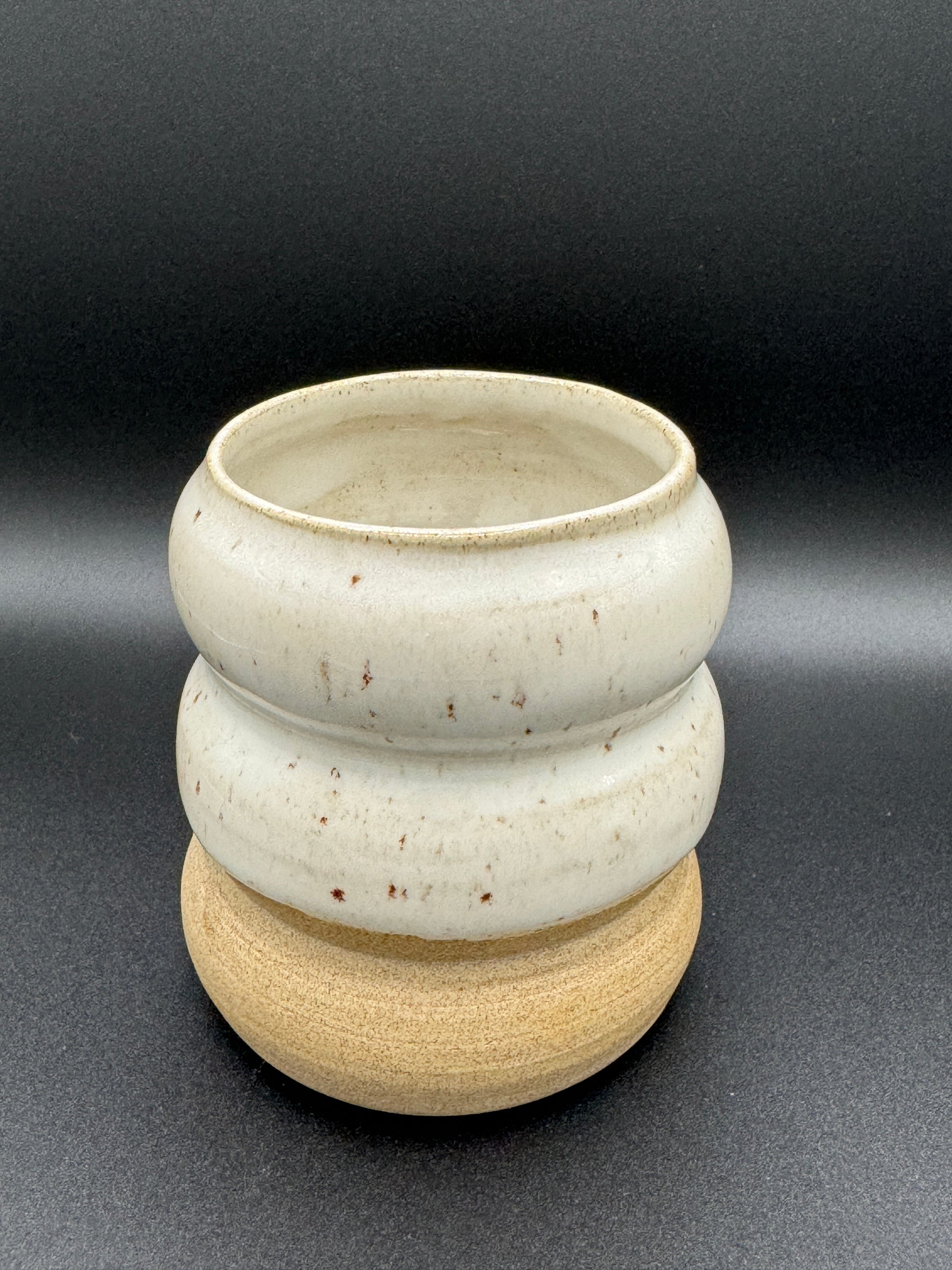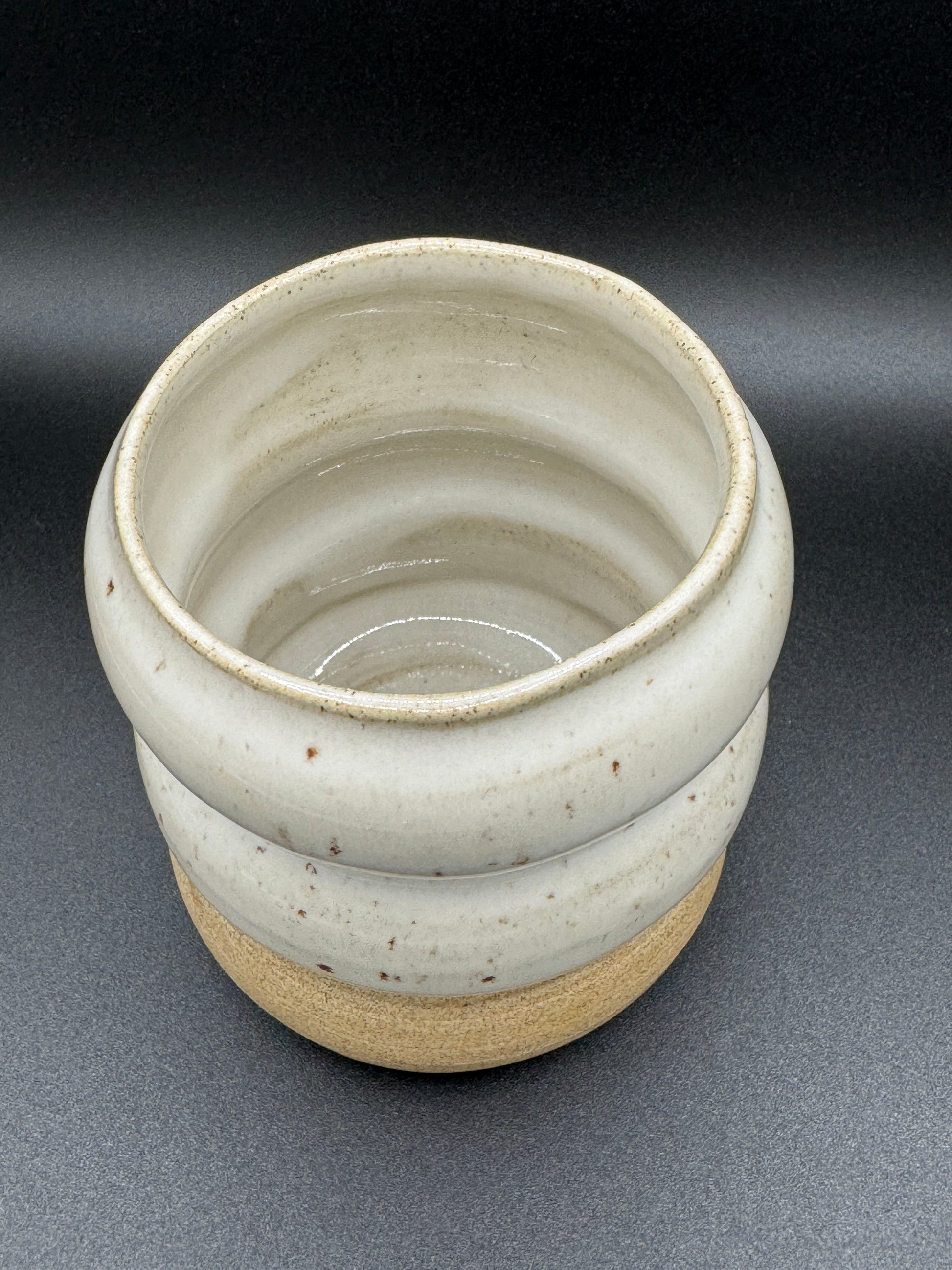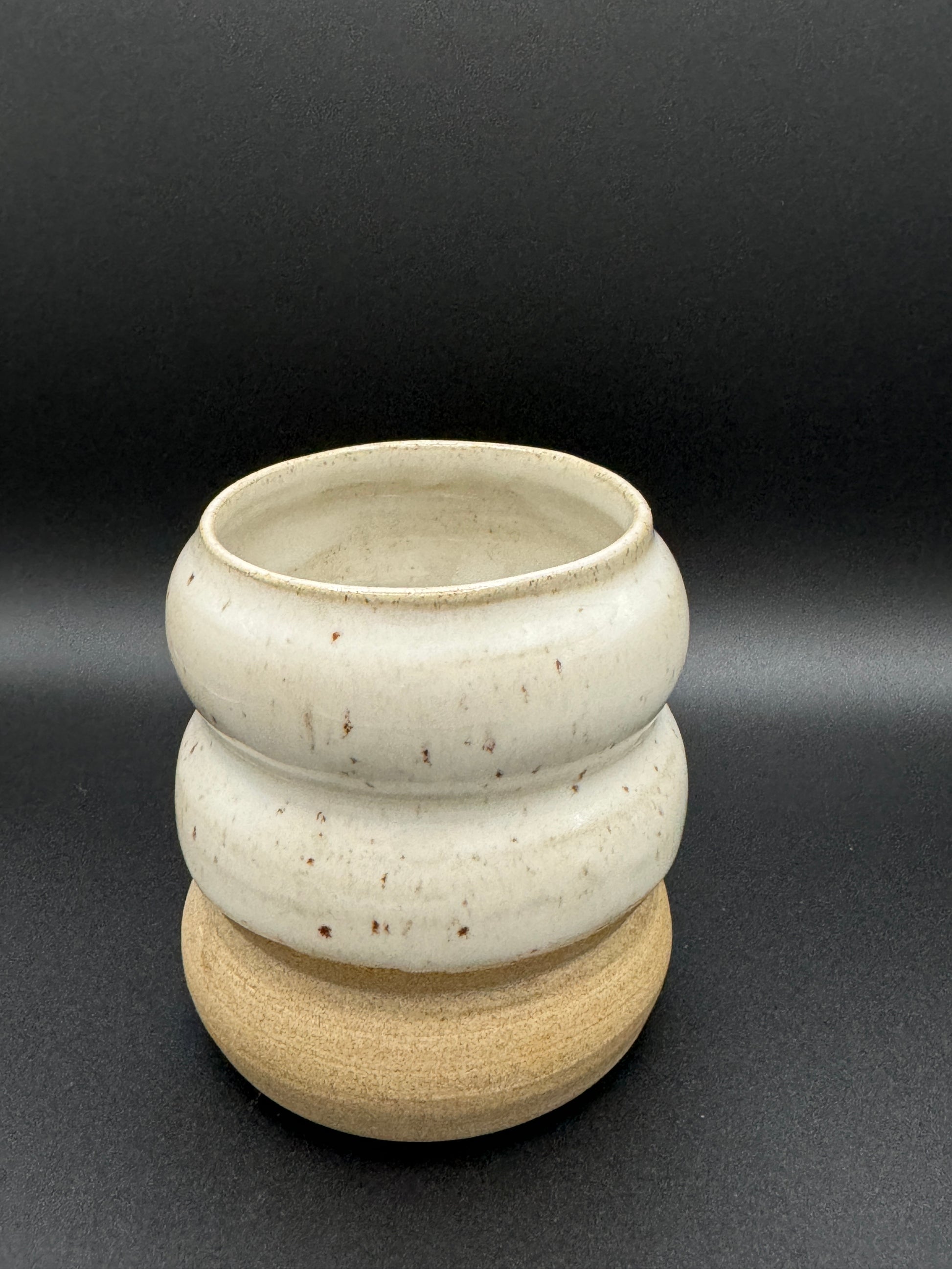 Becher aus weißem Ton mit weiß gepunkteter Glasur. Der Becher fasst ca. 230ml bzw 200ml. Er ist ca.7cm hoch und 8cm breit bzw. 8,5cm hoch und 7,5cm breit. Spülmaschinen-und Mikrowellenfest.
