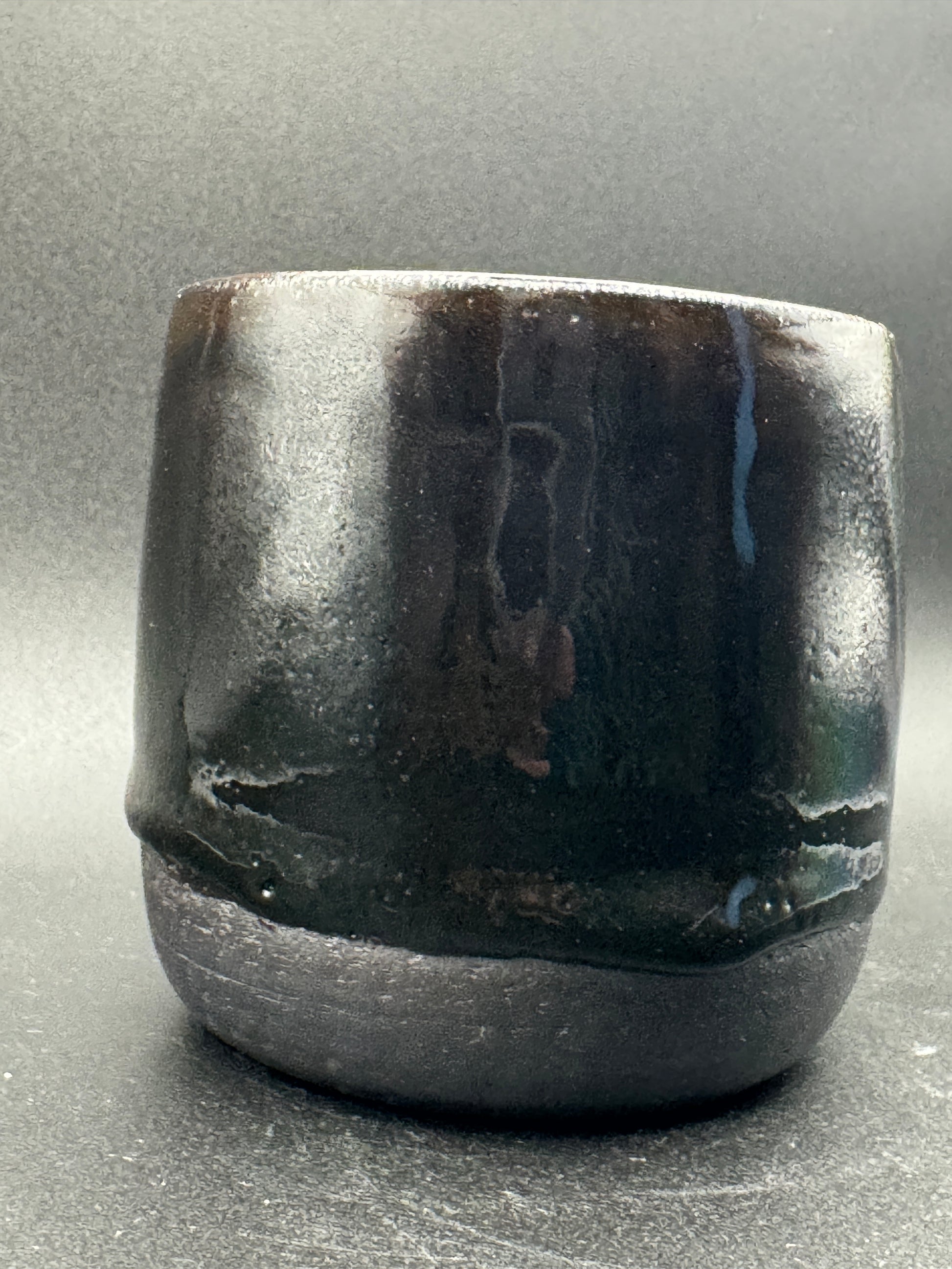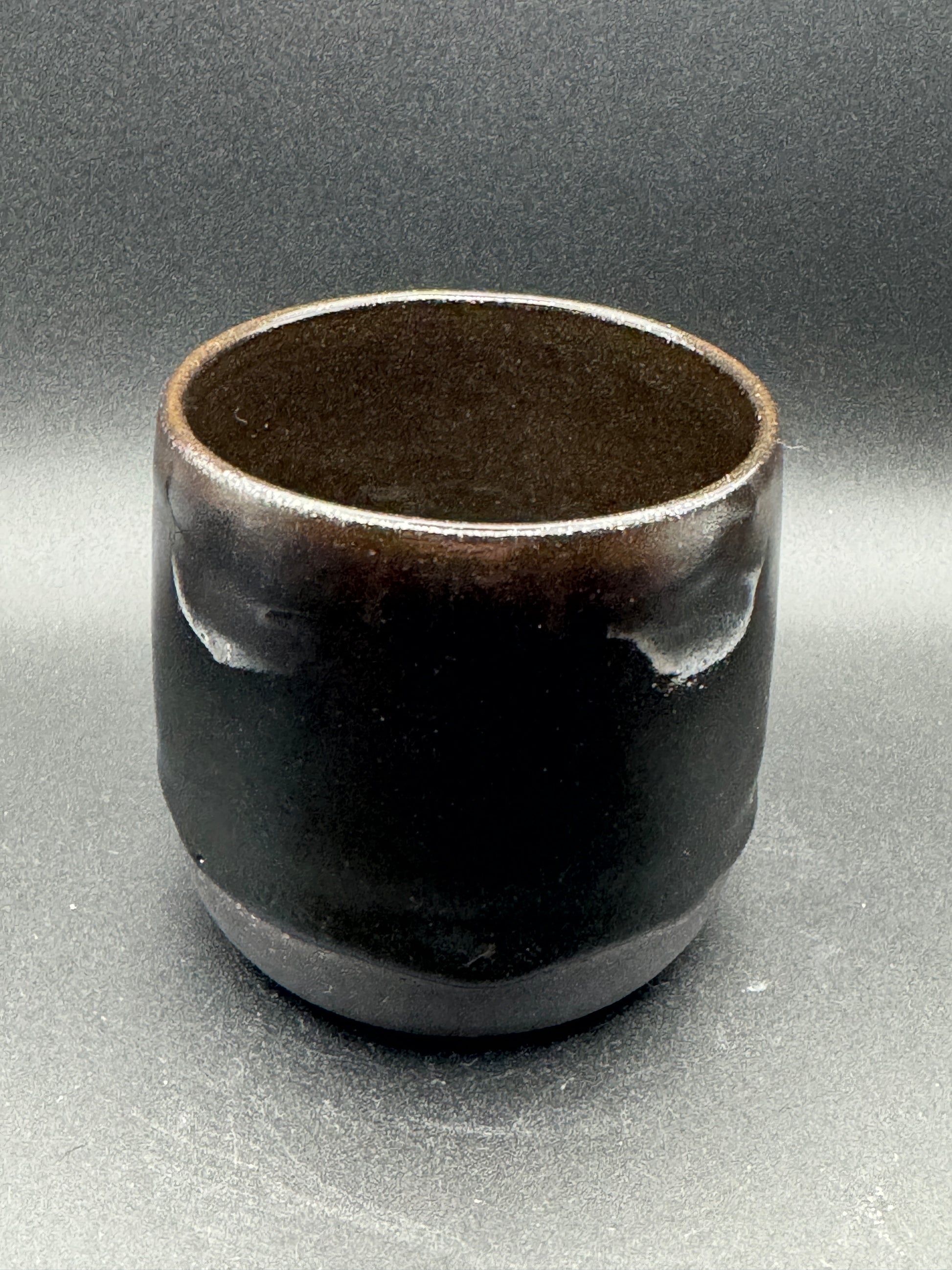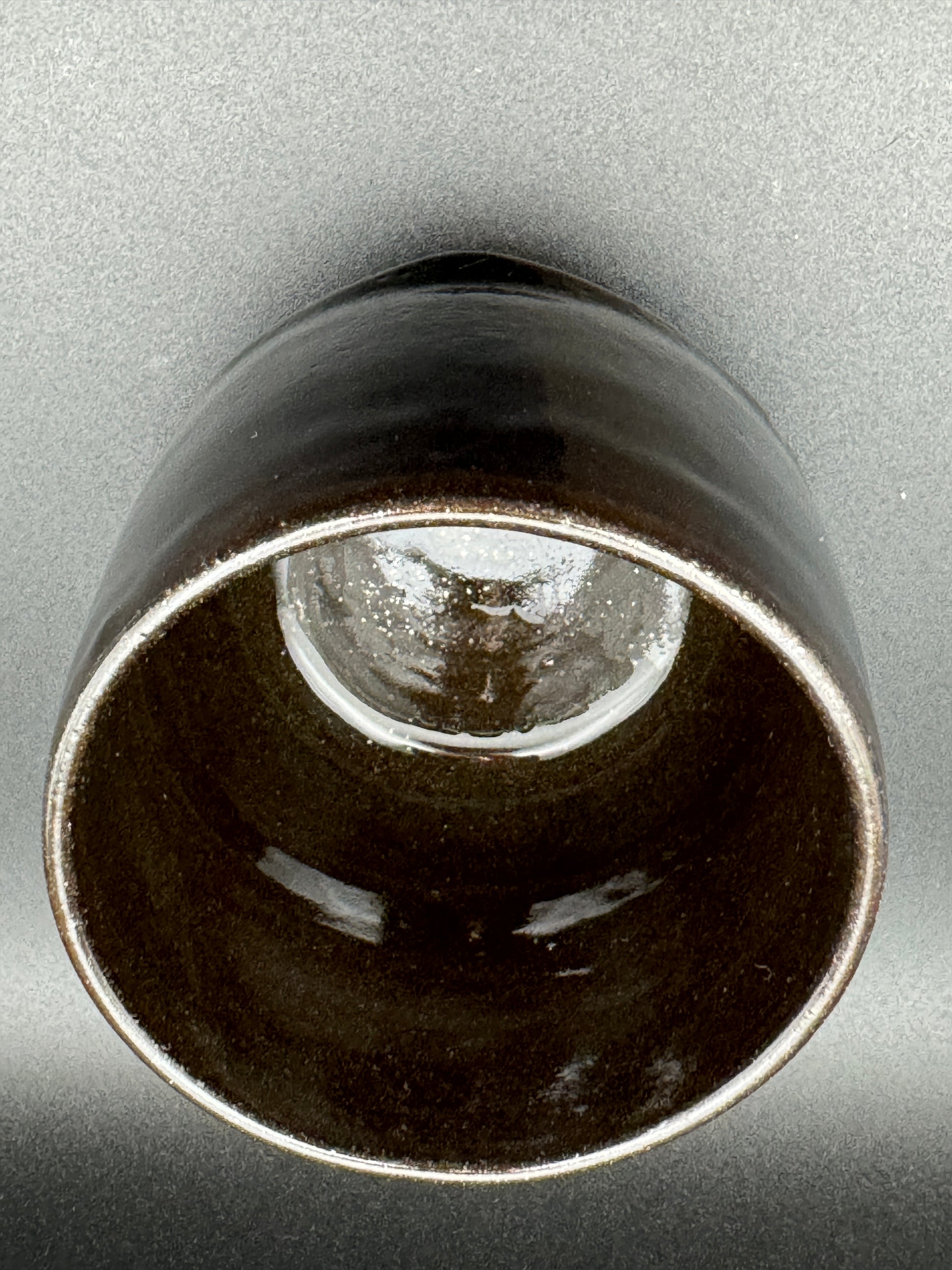 Steinzeugbecher in schwarz mit schwarzer Glasur. Innen ist er transparent glasiert. Der Becher fasst ca. 279ml ist ca 8 cm hoch und ca. 8 cm im Durchmesser.