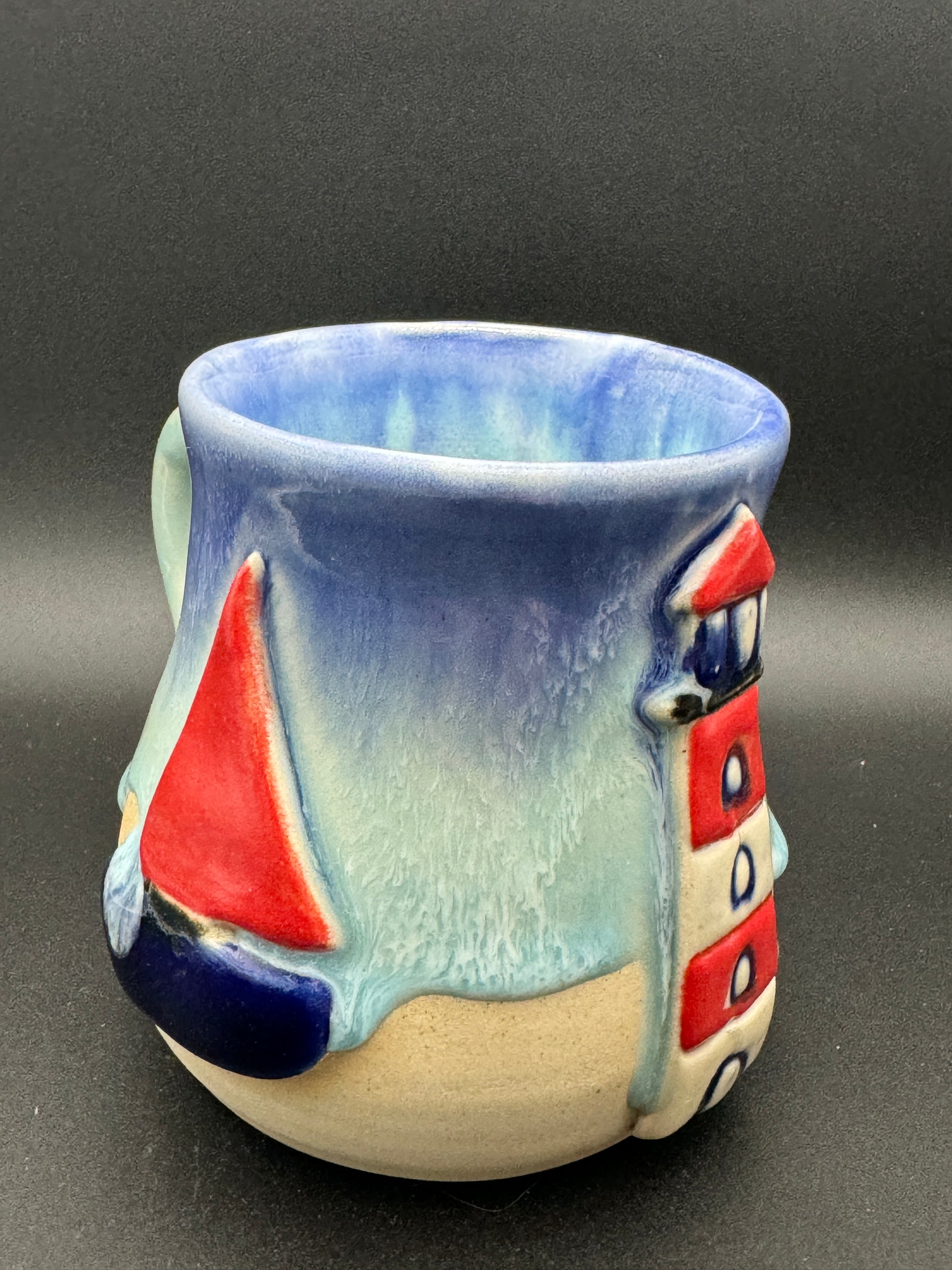Tasse mit Anker, Leichtturm und Segelschiff